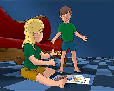 The boy is turned over. The girl who was drawing. She gives him its pencils. He is delighted.