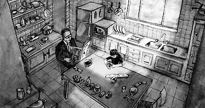 | A little girl and her father take their breakfast. Father reading a newspaper and listening carefully to the radio during the exchange. The little girl would like to have a little chat, but his father refuses.