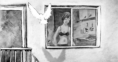 The young woman dismissed collapsed. A dove is pecking on the windowsill.