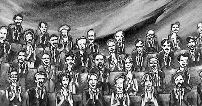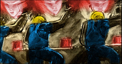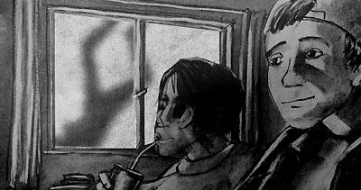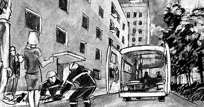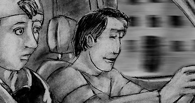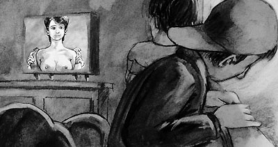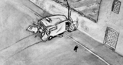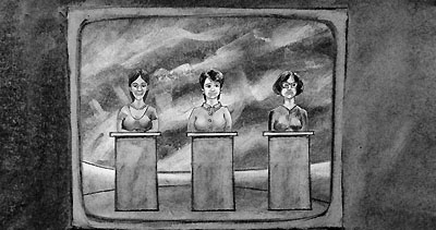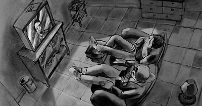 They observe the accident without moving while behind them, the TV quiz show continues ...