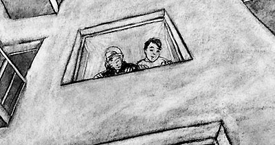 While the two teens still watch the game show, the upstairs neighbor falls out the window.