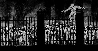 Workers manifest behind the gate of the factory. A man manages to get over the fence.