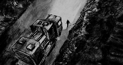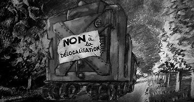 The truck moves away. This is the same truck that carries the poster "NO TO RELOCATION" which disappears into the night...