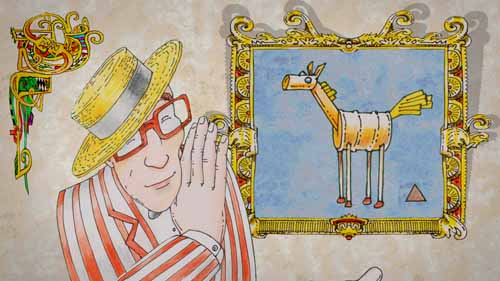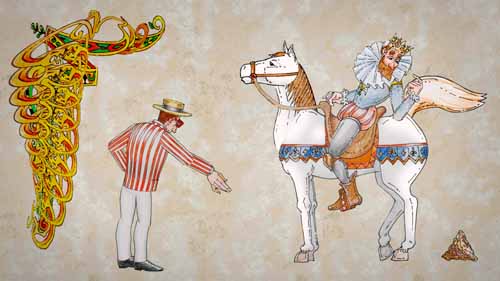 Minstrel (off): But at that very moment, Dame Fleurette, Henry IV's white stallion crapped a superb poop, worthy of a royal steed : authoritarian and majestic. Henry : So sorry, please forgive me, I'm embarrassed. Inventor : Don't mention it, your majesty. |
