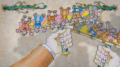 (The commoner who invented nuclear energy proceeded to give many an intricate explanation, while waving his arms like a wind mill. All the while he kept bowing to the king who was convinced.)