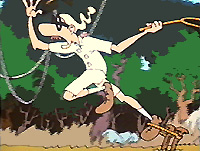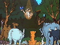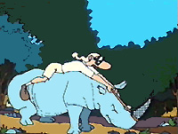 It goes on a dromedary, misses the butterfly, but not the horn of the rhinocérosse, slips on the horn of an elephant... |