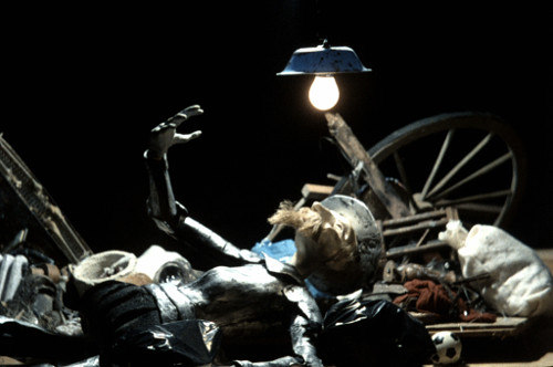 Don Quichotte a été jeté aux ordures... Une ampoule électrique se balance au dessus de lui. He catch it and reconise "Dulcinea"... |