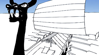 | Découpage : Un cellulo (une feuille de dessin animé) s'éloigne de la caméra. Elle se transforme en un flipbook duquel sort une mouette et un drakkar... Ses boucliers lattéraux se transforment en menhirs alignés... |