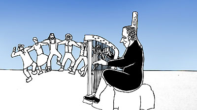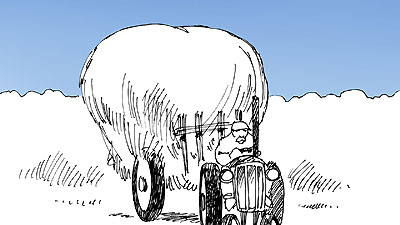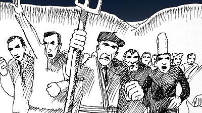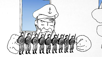 | Le visage du marin se transforme en centrale nucléaire fumante... Derrière la fumée se tient une manifestation de paysans. |