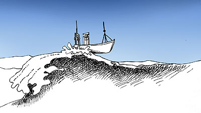 | (la maison bretonne s'est transformée en chalutier). Le chalutier fait face à une mer déchaînée... Il saute littéralement par dessus les déferlantes... |