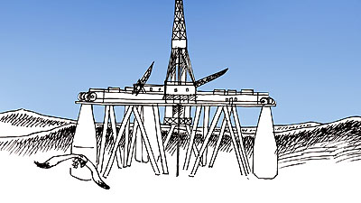 | Le chalutier croise une plateforme de forage en mer d'Iroise... La caméra suit une mouette qui survole bientôt le continent... |