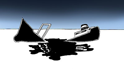 | Une fois la fête éloignée, la bigoudaine se transforme en Amoco Cadix. Le navire se brise en deux et déverse son pétrole... Un hélicoptère vient déverser son détergent. Un navire installe une balise. Le détergeant "nétoie" la nappe de pétrole... |