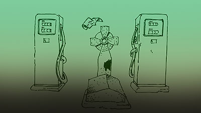 | L'eau est redevenue claire. Autour de la balise, les vacanciers naviguent... La caméra plonge dans l'océan en suivant la chaîne de la balise. Au fond, on découvre une tombe gardée par deux pompes à essence... |