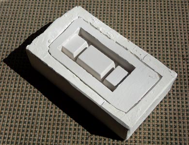 | J'ai donc créé en 3D une case (plus deux demi-cases de chaque coté) | Et je l'ai fait imprimé à Angoulême par "Les Fabricateurs". Voilà le résultat. | A partir de ce modèle, j'ai réalisé un moule en élastomère... | ... afin de tirer 25 épreuves en plâtre comme celle-ci... | J'ai ensuite assemblé toutes ces "photos" |