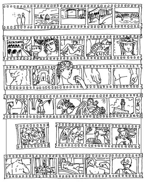 ( Souvent la première photo d'une pellicule est à moitié voilée. J'ai donc fait un pan incliné. On distingue trois personnages qui sourient, face à l'appareil photo.) Sur la deuxième bande, on entre dans la cour du Musée du Bargello. Le Bacchus de Michel-Ange nous attend (toujours ivre depuis 500 ans - Quelle santé !-) Leda de Bartolomeo Ammannati (élève du Maître). Puis la tête de Goliath à terre et David (celui de Donatello). Une représentation étonnante de David, nu mais avec un chapeau et des sandales impeccables... Troisième bande : Les atlantes inachevés de la galerie de l'Accademia. Le David de Michel-Ange est tout au fond. Trois gros plans du David. Quatrième bande, on ressort prendre l'air (il y avait beaucoup de monde...) On retrouve David devant la mairie (la signoria) face à la loggia dei Lanzi. A cet endroit il y a une sculpture extraordinaire de Benvenuto Cellini : Persée tenant la tête de Méduse. Le casque de Persée est très particulier: Il est posé sur la nuque. Et au dessus du casque se dresse un petit dragon. C'est très adroit, Persée baisse la tête (pour ne pas regarder la méduse) mais son casque est droit. Il est donc à la fois droit et courbé. La cinquième bande est tronquée. L'image isolée représente la bataille des Lapithe et des centaures à la Casa Buonarroti. L'image suivante représente un bout du cadre très étonnant de la Madone Tondo Doni. De ce cadre, cinq petites têtes se dressent... Pouvais-je éviter de représenter la Vénus de Botticelli ? La sacristie de l'église San Lorenzo constitue la dernière bande d'images. Les quatre allégories nous captivent. On oublierait presque de regarder la Piéta Médicis. La dernière image représente Laurent (Lorenzo) de Médicis coiffé d'un casque imaginaire (Casque qui ressemble étrangement à un masque de Donald Duck...) |