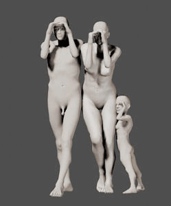 When the sculpture measured thirty centimeters, the nudity of the characters did not bother me. Full size, I immediately thought that these three characters should be dressed. All costumes should be the same to maintain unity. I wanted a representation of clothing that could be neutral. I opted for Jean's and T-shirt for everyone.