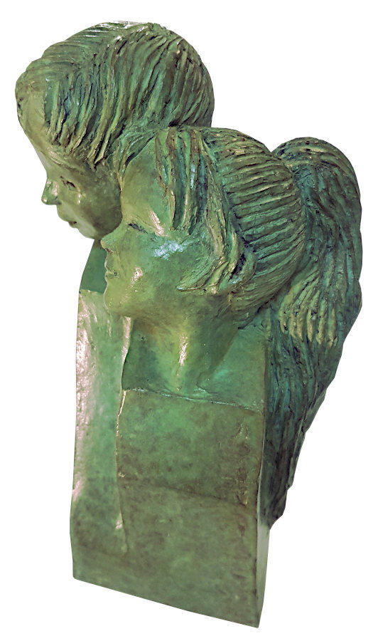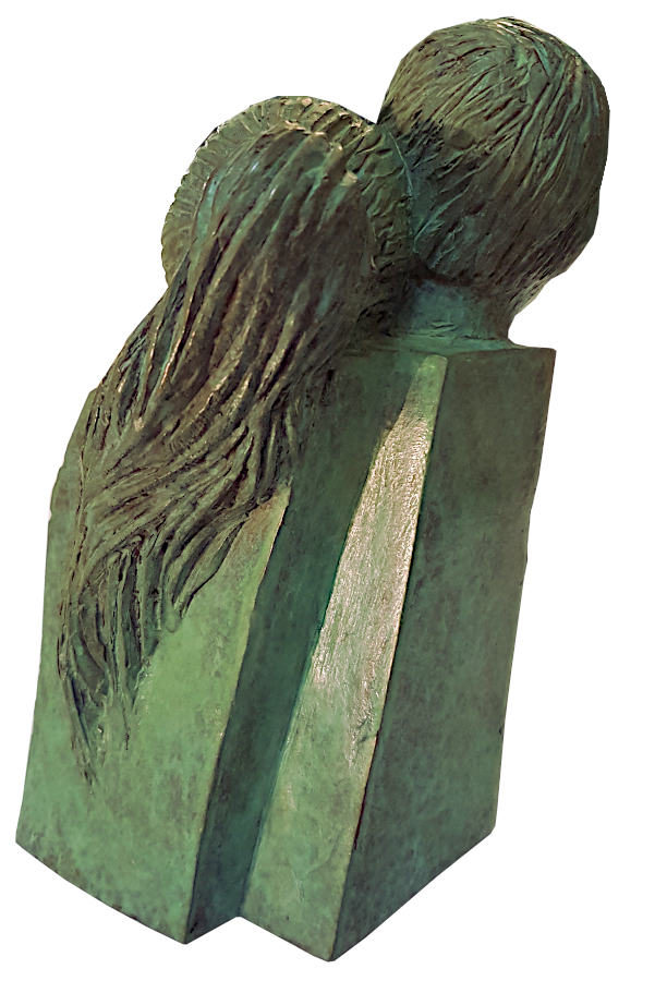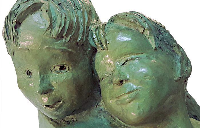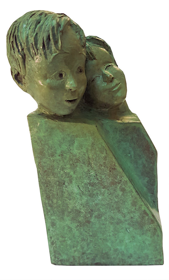 A very simple sculpture. A little girl hugs her neighbor. He expresses his surprise. and he is happy. |