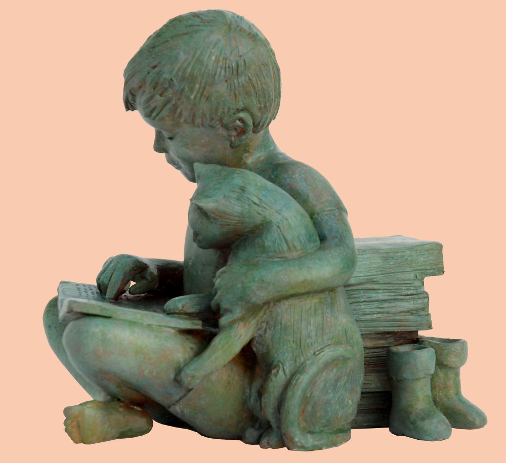 But how do we refocus on the boy ? In the great sculpture, the one in Montaigu, the boy read “Le chat botté”. On the pages of his book were engraved two drawings and an extract of the text. But here, in this small format, it was no longer possible.