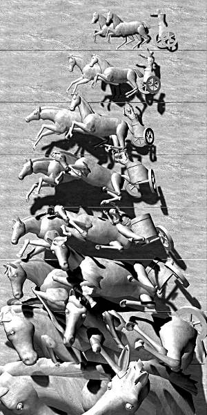 Thus I traced eight horizontal lines on the panel of the bottom. As the piece seemed to me difficult to realize, I then decided to model it in 3D for anticipate all the difficulties. Here is a first (virtual) vision of the piece whith its 16 horses and... 8 Phaeton ; a movie in 8 phases including each 2 horses and 1 Phaeton | |