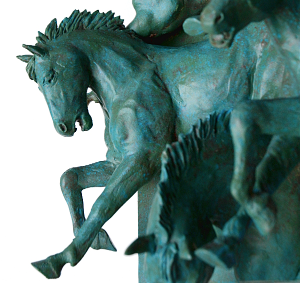 With the advice of a friend sculptor, Remi Polack, I deleted the first phase, that of the top. Too conventional. I also eliminated all the Phaeton except one. Then I pushed aside this fall too stiff... This phase of the work of modelling in 3D was thus wholesome, because I could approach my plaster more serenely ... Horses and Phaeton go beyond the limits of the frame, as if they exploded.