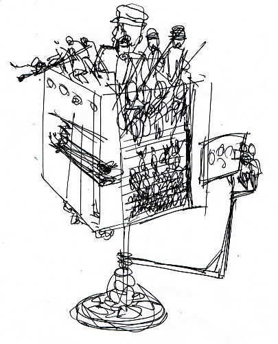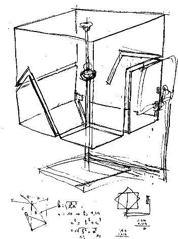 | I started from a purely geometric idea, I imagined different "corridors" to rock the sculpture . After a series of drawings I decided that a vertical half-slot was enough. Too many corridors would limit the surfaces of the sculpture. I didn’t know then what I would really do next... (we can distinguish a small character in front of a large magnifying glass) |