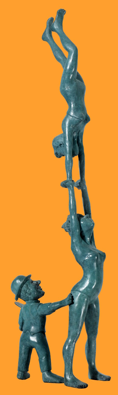 | La voltigeuse est plus légère, plus jeune aussi. Elle cherche son équilibre. Elle le trouve. Elle sourit... Leurs quatre mains sont solidement amarrées les unes aux autres. | |