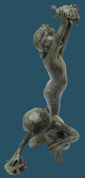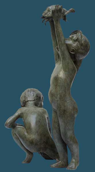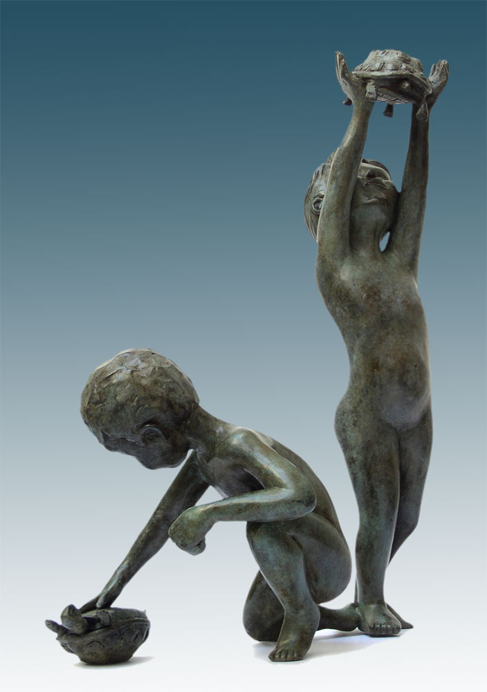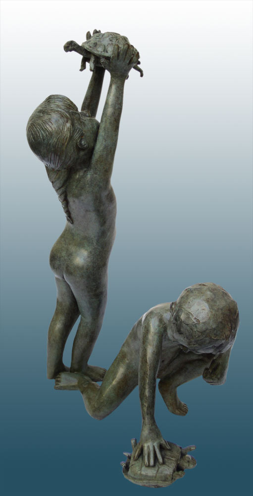 | Deux personnages, deux attitudes. Quand l'un retourne sa tortue pour la faire souffrir, l'autre l'élève vers le ciel comme pour en faire son idole... Dans les deux cas, les tortues restent impuissantes...