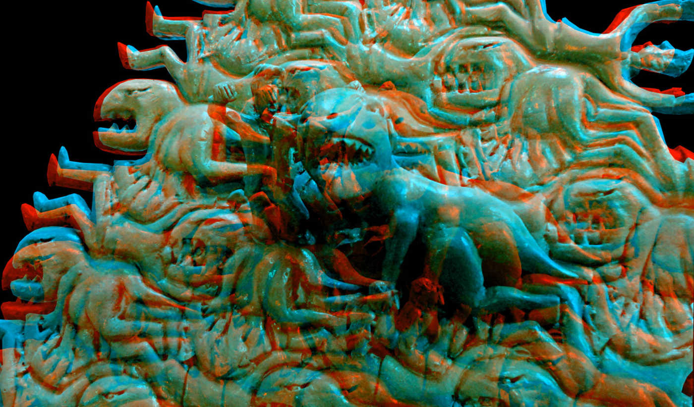 sculptures en relief ? Bruce Krebs ? Le dinosaure, l'homme et son chien ?