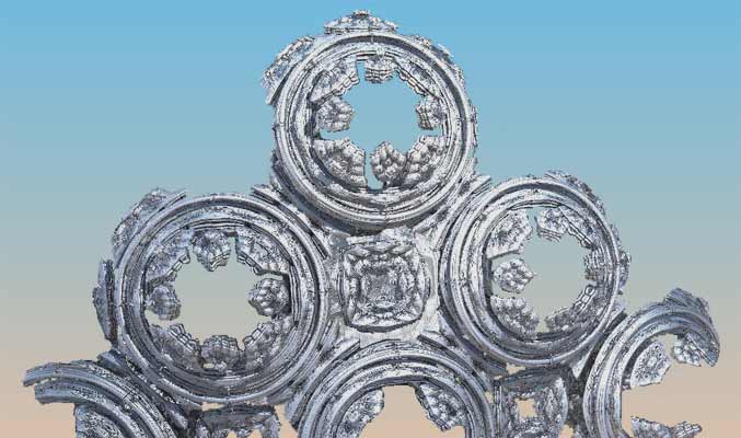 A cette époque je travaillais sur des images fractales*, et j'ai créé ainsi cette image de cercles tangents (ci-dessus). Aussitôt, Je me suis inspiré de cette forme pour ma sculpture, une forme sans référence.* les images fractales sont des images de synthèse 3D obtenues en croisant des formules purement mathématiques...![]()
